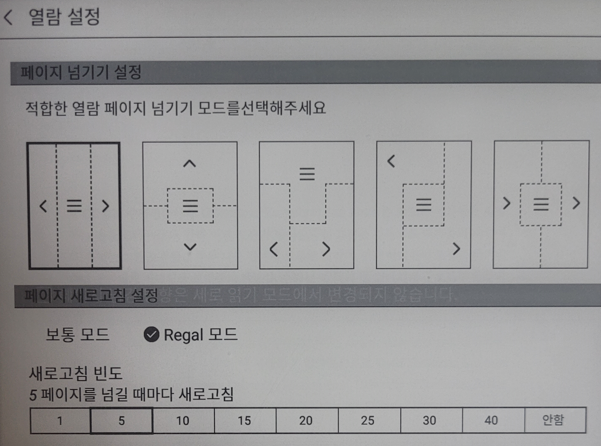 - 열람 설정 메뉴에서 새로고침(리프레쉬) 빈도를 조절 한 페이지를 넘길때마다 새로고침을 하는 경우 화면을 잔상없이 깨끗이 볼 수 있으나 깜박거리는 화면 전환이 빈번하기에 프로세서가 빠르지 않기에 눈에 거스를 수 있다. 대부분 기본이 5로 되어있는데 잔상이 있어도 크게 관여치 않게 보는게 더 자연스럽게 책을 보는 느낌이다