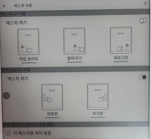 - 제스쳐부분은 성능상 그렇게 좋은 성능이 되지 않기에 기본으로 제스쳐 사용이 매우 거슬린다. 그래서 왼만하면 하단 제스처는 끄고, 측면 제스처는 키는게 좋다. 보통 글을 읽을때 백그라운드 빛을 사용할 일이 별로 없는데 밤이 되거나 어두운 공간에서는 백그라운드 빛을 키면 가독성이 좋아지고 왠만한 빛이 필요없는데 제스처 설정이 안되있으면 책보는데 많이 불편한데 이 기능은 키는 것을 권장한다