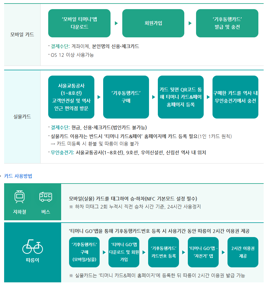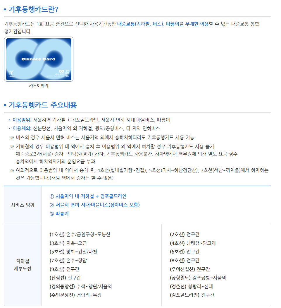 기후동행카드는 1회 요금 충전으로 30일간 대중교통 (지하철, 버스), 따릉이를 무제한 이용할 수 있는 대중교통 통합 정기권입니다. 이 카드는 서울 지역 지하철과 김포골드라인, 서울시 면허 시내·마을버스, 그리고 따릉이를 이용할 수 있습니다. 다만, 신분당선, 서울 지역 외 지하철, 광역/공항버스, 타 지역 면허버스는 제외됩니다. 버스의 경우 서울시 면허 버스는 서울 지역 외에서 승하차하더라도 기후동행카드를 사용할 수 있습니다. 기후동행카드는 시범사업을 거쳐 본사업으로 전환되었으며, 가격은 따릉이를 제외한 62,000원과 따릉이를 포함한 65,000원 두 가지 종류가 있습니다. 카드는 모바일카드와 실물카드로 구매할 수 있으며, 서비스 범위와 사용 방법에 대한 자세한 내용은 여기에서 확인하실 수 있습니다