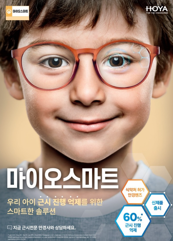 마이오스마트 (MiYOSMART)는 홍콩 폴리텍 대학과 호야 (HOYA)가 함께 개발한 제품입니다. 이 렌즈는 근시를 교정하면서 동시에 근시 진행을 60% 억제해주는 특별히 설계된 렌즈입니다. 2018년에는 스위스 제네바의 국제 발명 전시회에서 금상, 대상 및 특별상을 수상했으며, 2020년에는 실모 파리 안경 박람회에서 시력 부문 실모 도르 상을 수상했습니다. 한국에서는 약 2년여간의 식약처 인증 과정을 거쳐 2022년에 공식적으로 출시되었습니다.