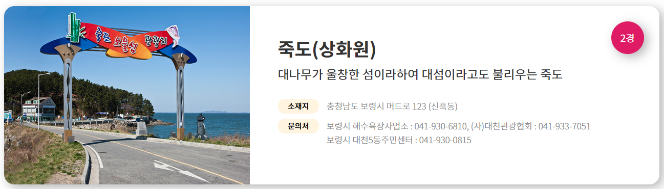 원래 죽도는 보령시 남포면에서 서남쪽으로 8.1㎞, 최치원 유적지가 있는 보리섬 서쪽 1.5㎞ 지점에 있는 섬으로 옛날 대나무가 울창하였던 섬이라 하여 대섬 또는 죽도라 부르게 되었다고 합니다. 대천해수욕장에서 3㎞ 떨어져 있는 남포 방조제와 연계되어 있는 섬으로 대천 해수욕장과 남포 방조제 끝머리에 있는 용두 해수욕장의 중간 지점에 있는 섬이었는데 지금은 '상화원'이라는 한국식 휴양 정원으로 탈바꿈 하였습니다. '상화원'은 섬 전체가 하나의 정원으로서 천혜의 섬 죽도가 지닌 자연미를 그대로 살린 한국식 전통정원입니다.