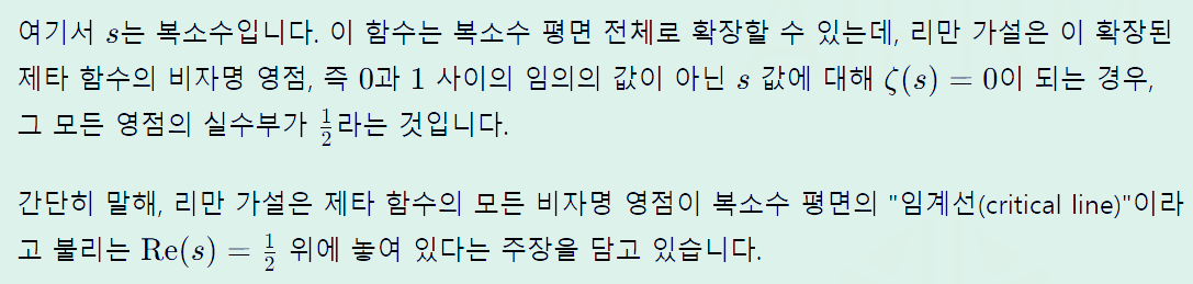 리만 가설(Riemann Hypothesis)은 수학에서 가장 중요한 미해결 문제 중 하나로, 특히 정수론과 복소해석학에서 핵심적인 역할을 합니다. 이 가설은 독일의 수학자 베른하르트 리만(Bernhard Riemann)이 1859년에 제안한 것으로, 리만 제타 함수(Riemann zeta function)의 비자명 영점(non-trivial zeros)에 관한 가설입니다.