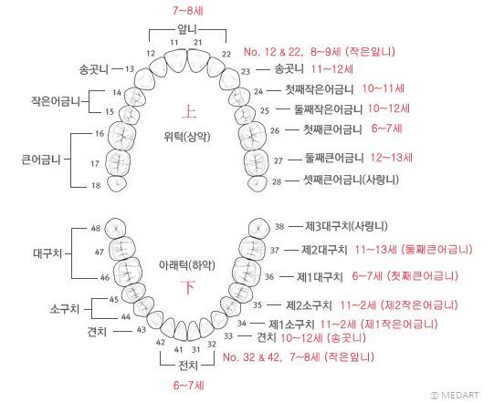 일반적으로 6세 정도에 어린이의 첫 번째 영구 앞니인 61, 영구 아래니인 71번이 나타나기 시작합니다.