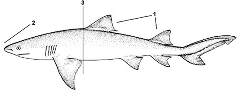 1. 제1등지느러미와 제2등지느러미는 삼각형이며 크기가 거의 비슷하다.
