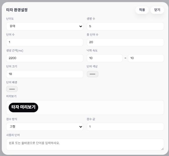 단어 내려오는 속도 및 단어 수, 단어 크기 등을 설정하는 화면