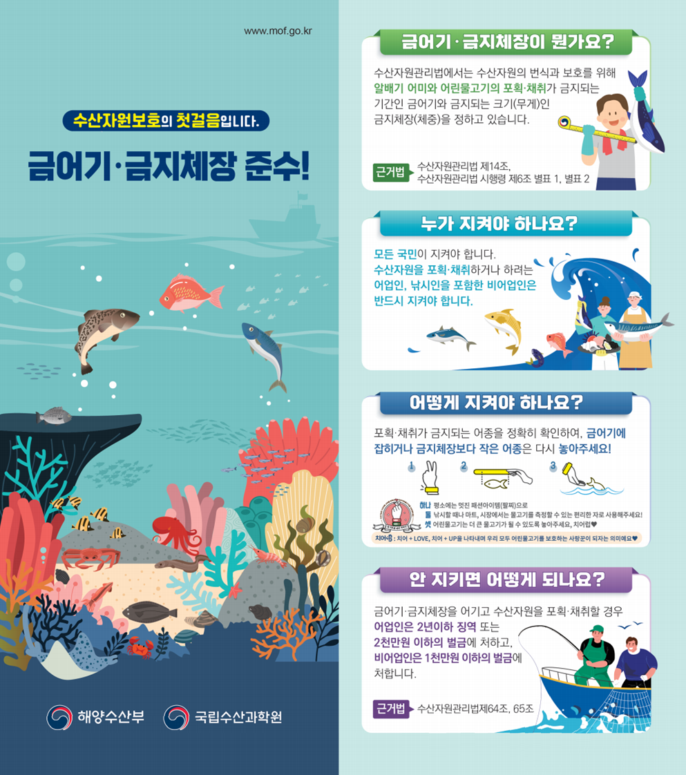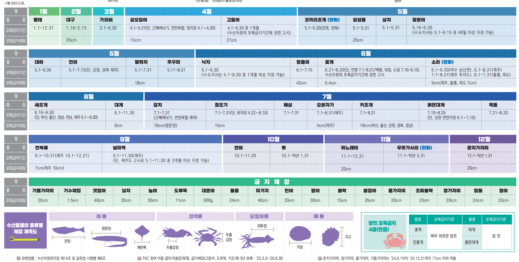 수산자원관리법에서는 수산자원의 번식과 보호를 위해 알배기 어미와 어린 물고기의 포획 채취가 금지되는 기간인 금어기와 금지되는 크기(무게)인 금지체장(체중)을 정하고 있습니다. 그것과 관련한 따뜻한 2024년도 정보를 업데이트 합니다.