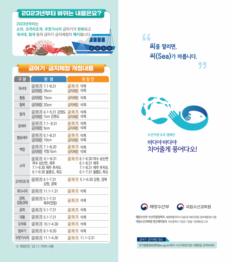 2023년부터 바뀐 내용 소라, 코끼리조개, 우뭇가사리 금어기가 완화되고 개서대, 털게 등 금어기 금지체장