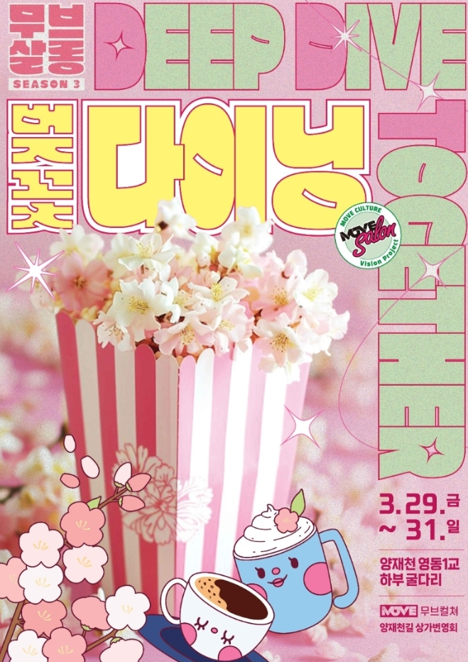 DEEP DIVE TOGTHER! 대한민국 최초, 축제형 살롱 무브살롱 시즌3: 벚꽃다이닝 주제는 '벚꽃푸드 (벚꽃 + F&B)'로 양재천의 아름다운 벚꽃과 함께 즐기는 낭만적인 다이닝 축제이다. 무브컬쳐가 주최하는 <무브살롱>은 나만의 취향을 찾고 비슷한 취미를 가진 사람들과 만남과 대화를 통해 삶의 활력을 부여하는 '살롱문화 형성'을 목적으로 하는 축제형 살롱이다.무브살롱의 특징은 사람들과의 만남과 소통, 공감과 유대를 이끌어 내는 프로그램을 통해 개인의 활력, 나아가 도시 전체의 활력을 부여하는 역동적인(move) 축제형 살롱이자 회차별 살롱 주제를 변화(move)시켜 다양한 문화예술적 영감과 새로운 취향에 대한 경험을 제공하는 것이다. 지난 2023년 '무브살롱 런칭페스티벌'을 시작으로 '무브살롱 시즌2: 펫토피아'까지 마무리했다.