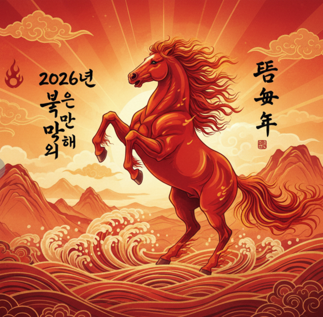 병오년(丙午年)의 의미 병(丙)은 천간의 셋째로, 양의 불(陽火)을 의미합니다. 불의 색은 붉은색이므로 2026년은 전통적으로 ‘붉은 말의 해라고 불립니다. 오(午)는 지지의 일곱 번째로 말을 상징하며, 움직임·활동성·변화·열정을 의미합니다.