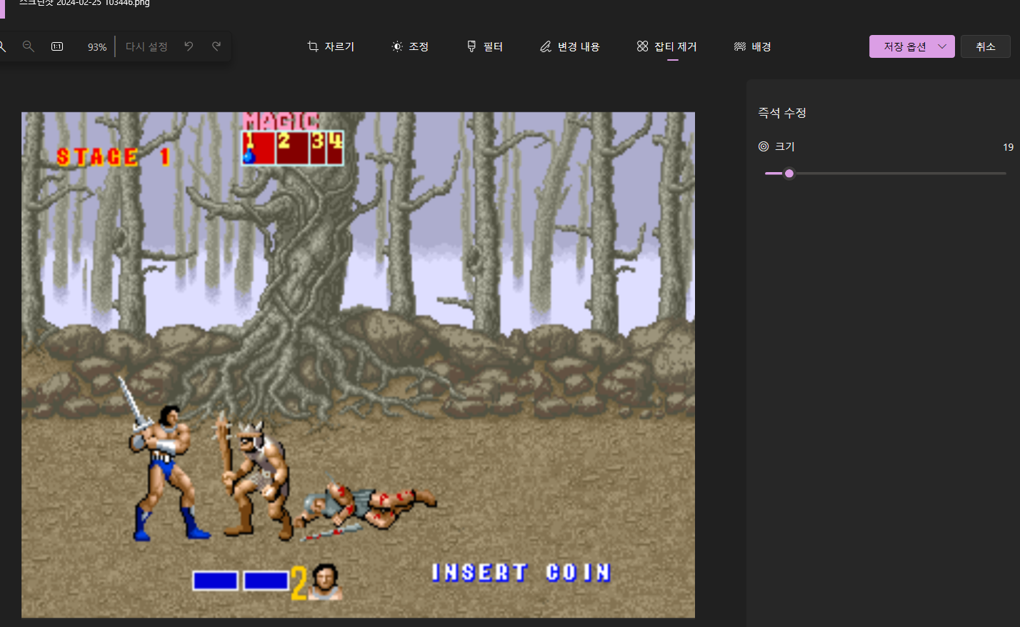 두번째, 오른쪽 즉석수정 카테고리에 크기를 선택해 주세요 아이템의 크기보다 작게 해 선택 범위를 선택 할 수 있도록 조정합니다. 그리고 조정이 됐으면 그림에서 지우고자 하는 대상에 마우스 왼쪽 클릭으로 선택해 주시면 지워집니다. 배경이 그대로 자동으로 그려진 상태로.