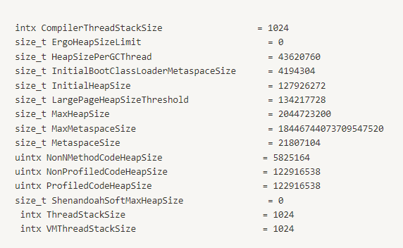 java -XX:+PrintFlagsFinal -version | grep -iE 'heapsize|permsize|threadstacksize|MaxMetaspaceSize|MetaspaceSize’